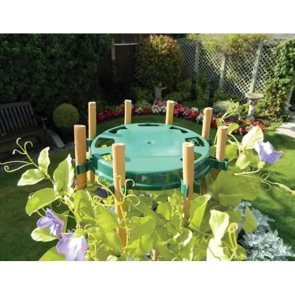 Gebruik deze ring om bamboestokken snel en makkelijk bij elkaar te binden tot een stevige piramide om planten langs te laten groeien. Geschikt voor 8 bamboestokken.