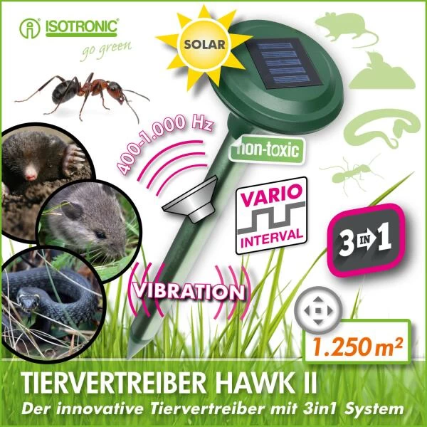 Mobiele dierenverjager voor buiten op zonne-energie. De drie-in-één HAWK II POWER zendt ultrasone frequenties (400-1000 Hz / zelfsturend) uit, heeft een ultrasterke vibratiemoter en schrikt dieren af met een roterend drievoudig blauw ledlicht. Het toestel wordt gevoed door een SOLAR-paneel (polykristallijne zonnecellen) in de kop van de verjager, volledig opgeladen is het tot 6 dagen en nachten werkzaam!