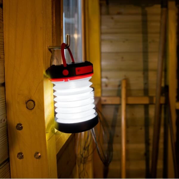 Voorzien van een aan/uit-schakelaar en twee verlichtingsniveaus. Deze draagbare pop-up lantaarn geeft ca. 5 tot 10 uren licht bij volle batterij, afhankelijk van het verlichtingsniveau.