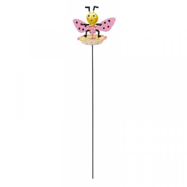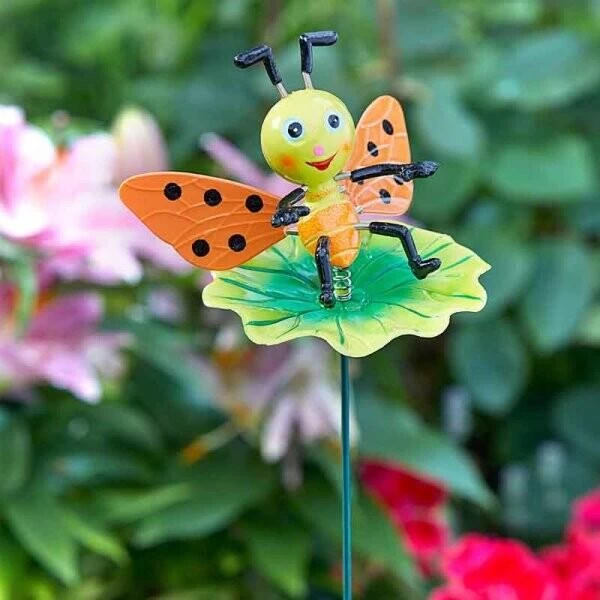 De ene bij heeft roze vleugels en zit op een bloem, de andere bij heeft oranje vleugels en zit op een blad. Ze hebben beiden een lieflijke blik en een mooie glimlach. Prik de bijtjes tussen bloeiende planten in de border want dat is hun natuurlijke habitat maar ze staan ook beeldig op het terras of balkon in een bloempot.
