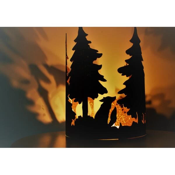 Een prachtig vervaardigde decoratieve ring van een natuurtafereel met 3 dennenbomen, 2 herten, een vos en een vogel. De ring is prachtig als tafeldecoratie rond kaarsen, kerstballen, dennnenappels, sierfruit… maar ook in verschillende bloemcreaties vormt deze decoratie een grote meerwaarde.