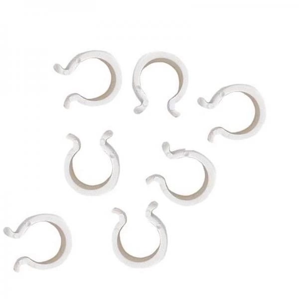 Stevige kunststof klemmen voor het vastzetten van folie, insectengaas, weringsnet of zeil aan buisvormige structuren.