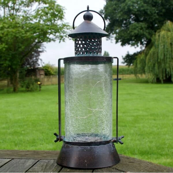 Deze mooie lantaarn heeft iets weg van een oude petroleumlantaarn. Het decoratief gekrakeleerd glas en metaal met verouderde look geeft deze lantaarn een oude uitstraling. Dit lichtpunt werkt op zonne-energie en geeft ’s avonds een gezellig sfeerlicht.