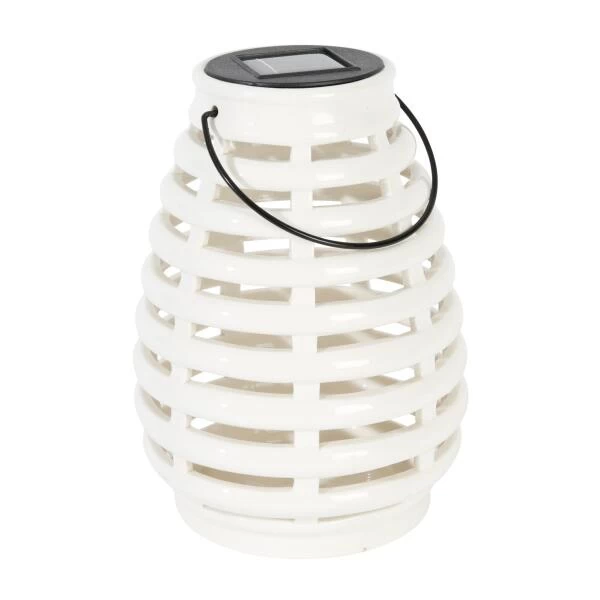 In het dak van de lantaarn zit een solarpaneeltje dat de geïntegreerde batterij van energie voorziet waardoor deze mooie lantaarn ’s avonds oplicht. Dankzij het open patroon van deze keramische lantaarn, kunnen we genieten van een mooi licht- en schaduwspel.