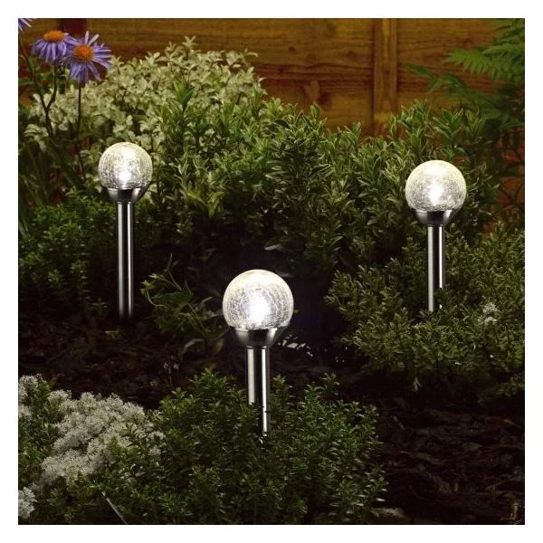 Tuinverlichting hoeft niet saai te zijn. Dat bewijst deze opmerkelijke verlichtingspaal. Een mooie glazen lichtbol in gekrakeleerd glas die rust op een metalen grondpin.