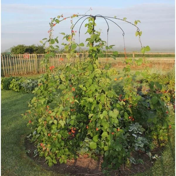 Dit systeem bestaat uit een centrale paal met een grondpin, zes bogen en zes touwen die je als een parasol kan opstellen in de tuin. Op die manier heb je zeven steunpunten waarlangs je de planten kan laten groeien.