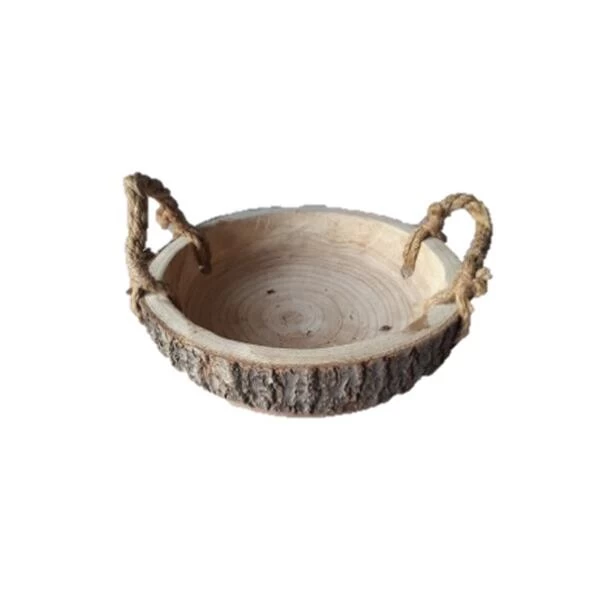 De plateau is afgewerkt met schors en bestaat uit paulownia hout. Elke mand heeft een unieke kleur en houttekening.