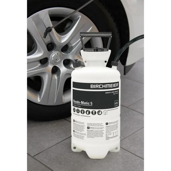 Met de Rondo-matic birchmeier druksproeier koop je een compact toestel met een maximale chemische weerstand tegen verdunde zuren en alkali-oplossingen. Deze compacte drukspuit heeft een slagvaste vultank van 5 liter met maataanduidingen in liter en in gallon (VS).