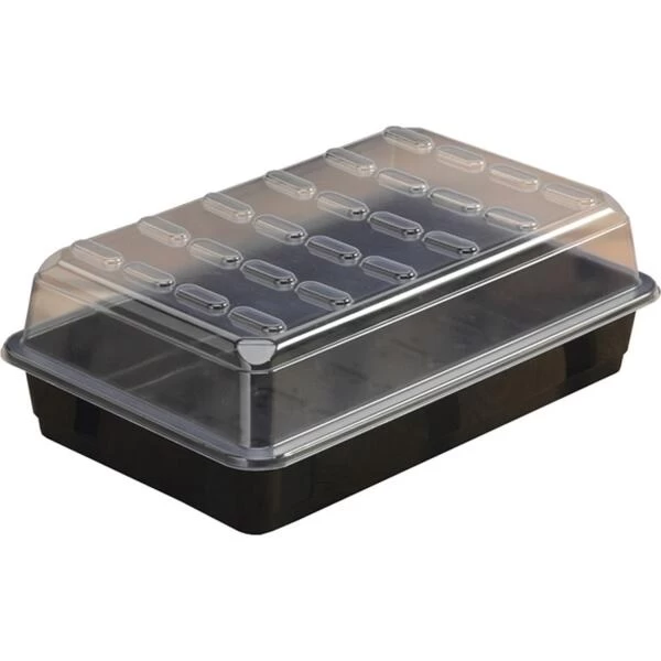 Deze sterke zaaibak met kunststof deksel is een goedkope maar duurzame kweekkas om planten te zaaien en te stekken zonder serre of tuinkas.